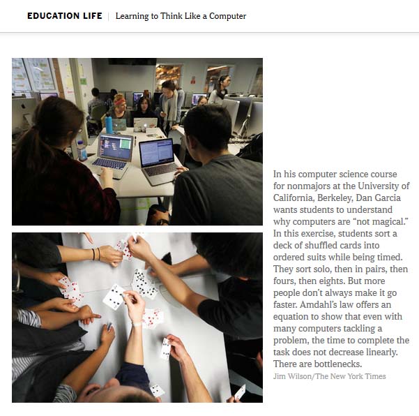 上图为纽约时报对Berkeley资深计算机教育专家Dan Garcia创新型教学的报道,图中Dan正在用纸牌结合Snap!教授排序、并行计算、瓶颈等概念。